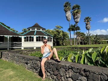 Sitting in my new yellow pants in a very big chair at the International Marketplace in Waikiki